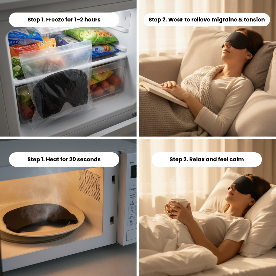 Simply place the mask over your eyes and forehead. For cold therapy, keep it in the freezer for 1–2 hours before use. For heat therapy, warm it up in the microwave in short intervals.